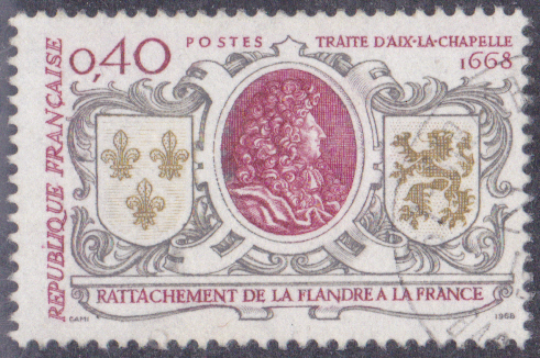 Zum Thema "300 Jahre Friede von Aachen" (Der Devolutionskrieg (1667–1668) war ein militärischer Konflikt zwischen Spanien und Frankreich, der mit dem Frieden von Aachen beendet wurde) ist in Frankreich eine Marke (MiNr 1628), die eine Porträt von König Louis XIV. und die Wappen von Bourbon und Flandern zeigt.