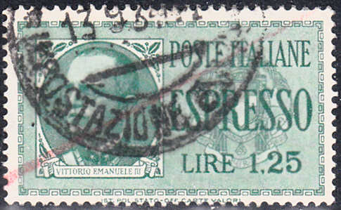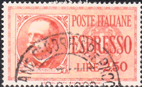 Weitere Freimarken mit König Viktor Emanuel III. in einem anderen Design sind ab 1927 erschienen. Hier zeige ich eine zweifarbige Marke zu 50 Lire (MiNr 263).