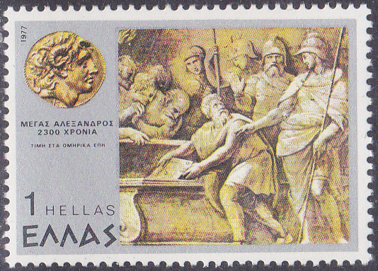 Die Marke zu 1Dr (MiNr 1268) zeigt "Alexander der Große legt Werke Homers beim Grabmal von Achill nieder" nach einem Fresko von Raffael.