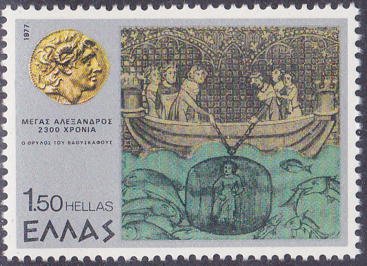 Auf der Marke zu 1,50Dr (MiNr 1269) sehen wir "Alexander der Große taucht in die Tiefe des Meeres" nach einer flämischen Miniatur.