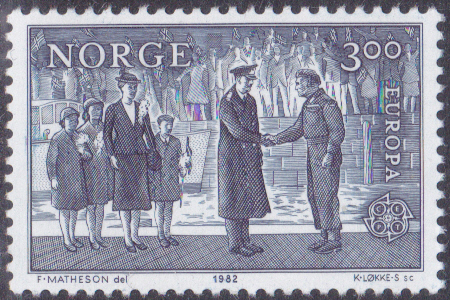 Eine zweite Europamarke 1982 (MiNr 866) zeigt dazu die Abbildung Kronprinz Olav empfängt König Haakon VII. im Jahre 1945.