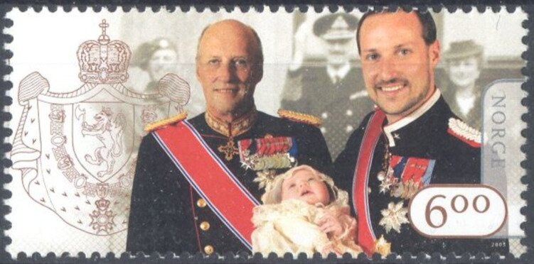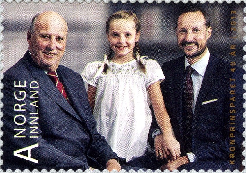 Auf einer Marke (MiNr 1822) zum 40. Geburtstag von Kronprinz Haakon sind König Harald V., Kronprinz Haakon und seine Tochter Prinzessin Ingrid Alexandra zu sehen.