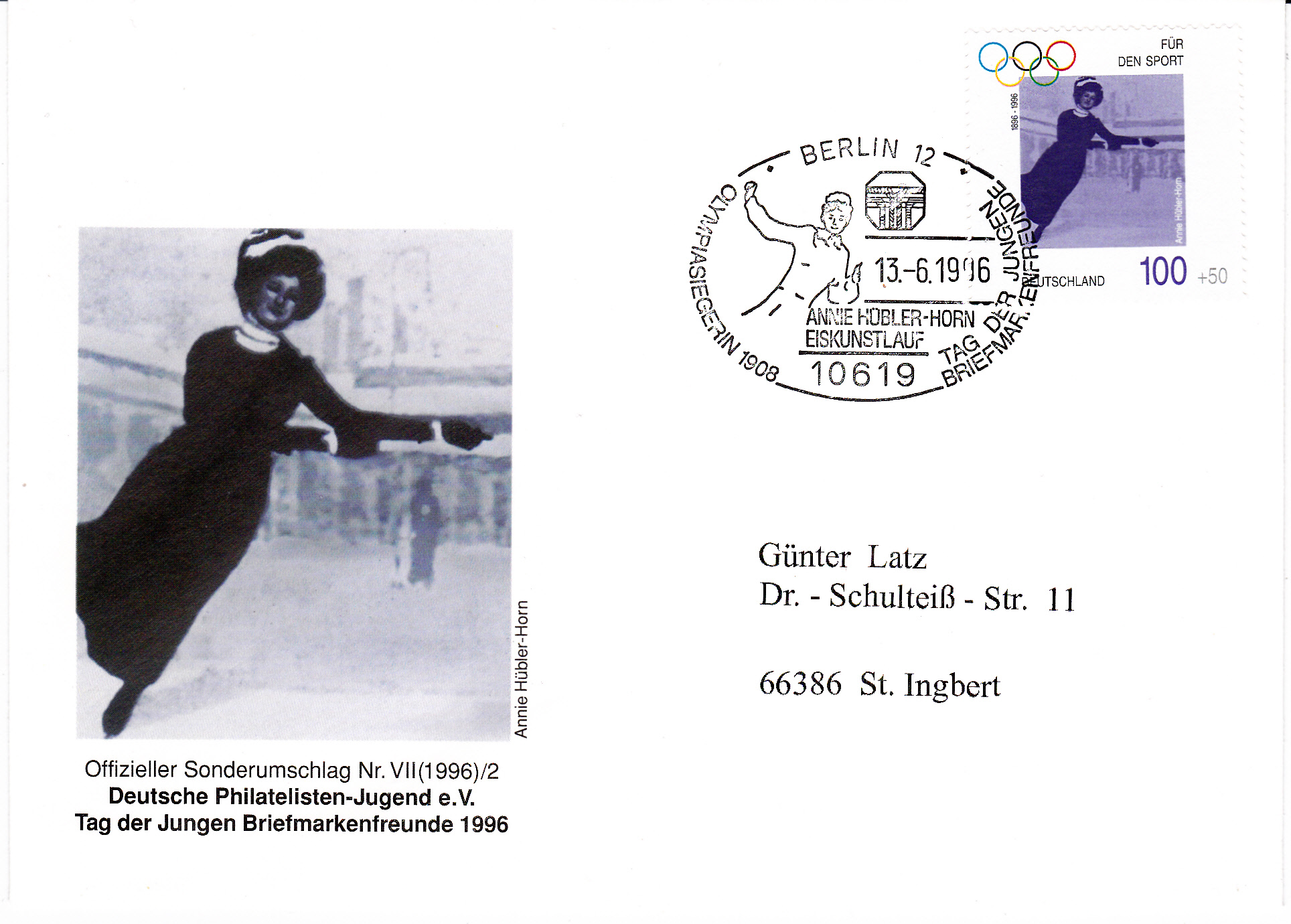 In der Zuschlagserie zu den Olympischen Spiele 1996 ist Annie Hübler-Horn auf einer Marke abgebildet. Diese wurde hier mit dem Sonderstempel aus Berlin 12 zum Tag der Jungen Briefmarkenfreunde am Ersttag gestempelt. Im Stempelbild ist ebenfalls Annie Hübler.Horn zu sehen.