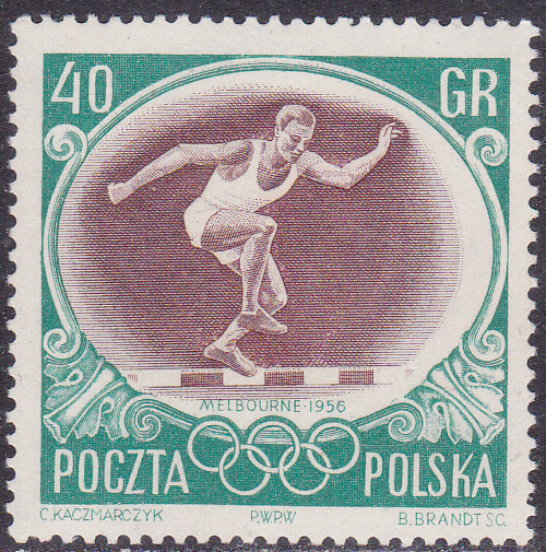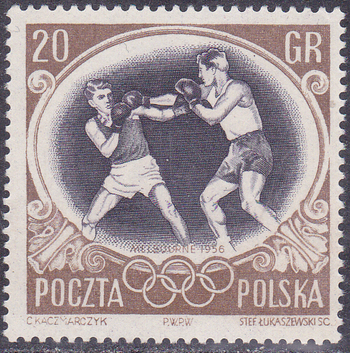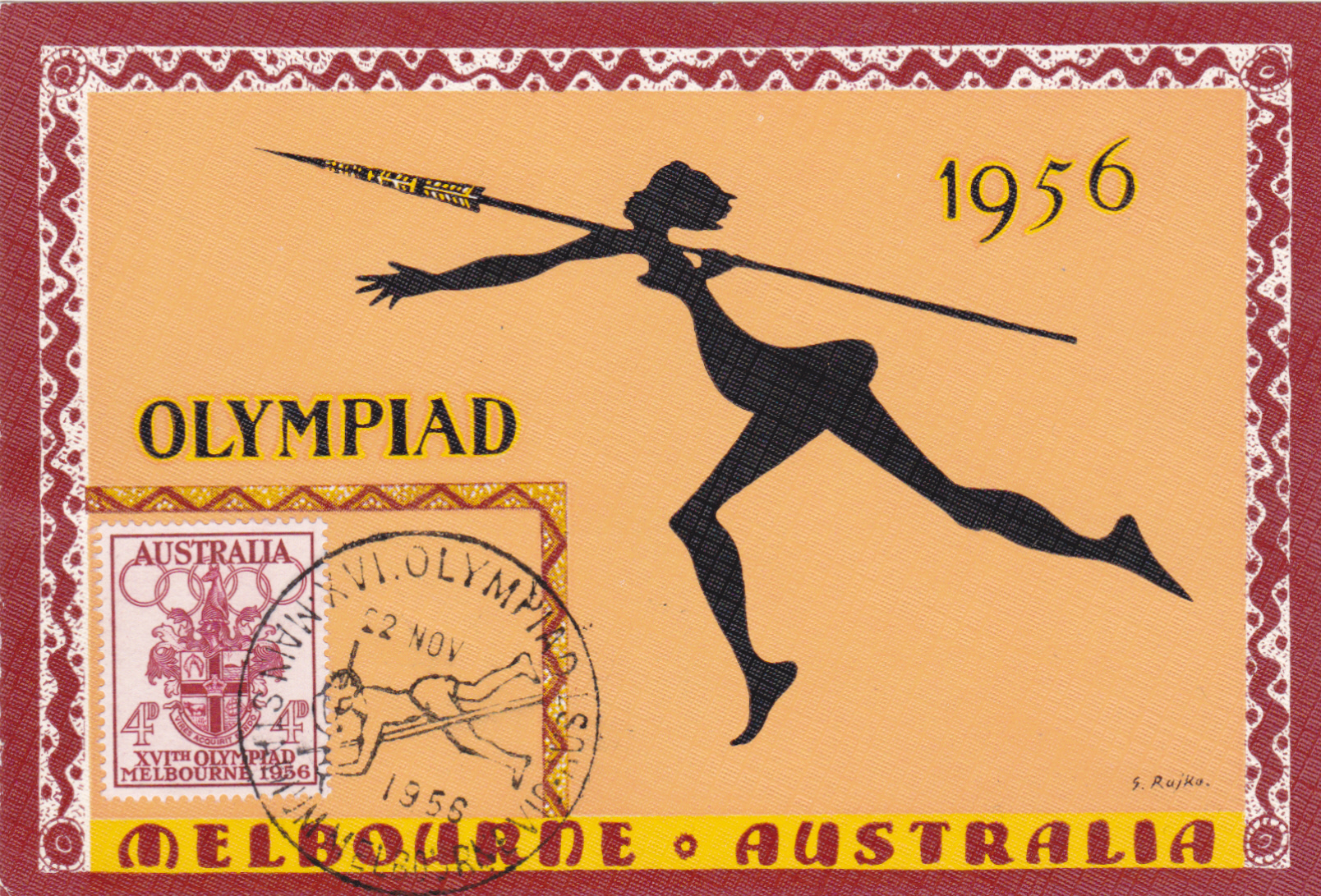Maximumkarte (mit einem Motiv zur Olympiade 1956) mit der Marke zu 4 Pence (MiNr 266) aus Australien mit dem Wappen der Stadt Melbourne und den olympischen Ringen sowie einem Sonderstempel vom 22.11.1956 zu den Spielen in Melbourne.