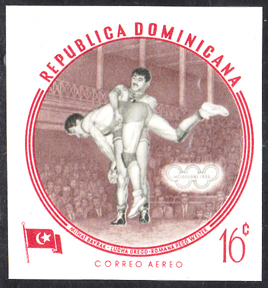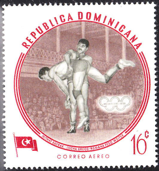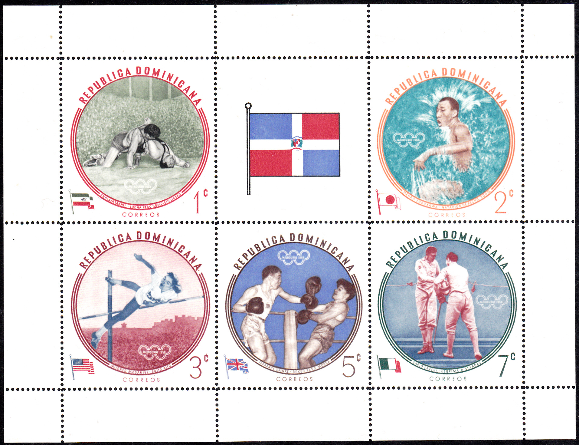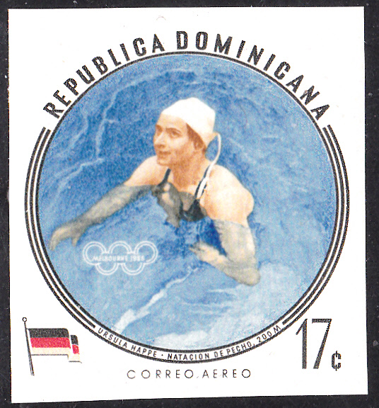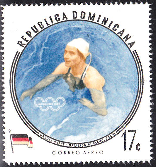 In der gleichen Serie aus der Dominikanischen Republik mit Olympiasieger 1956 gibt es auch eine Marke (MiNr 729 A) mit Patricia McCormick.