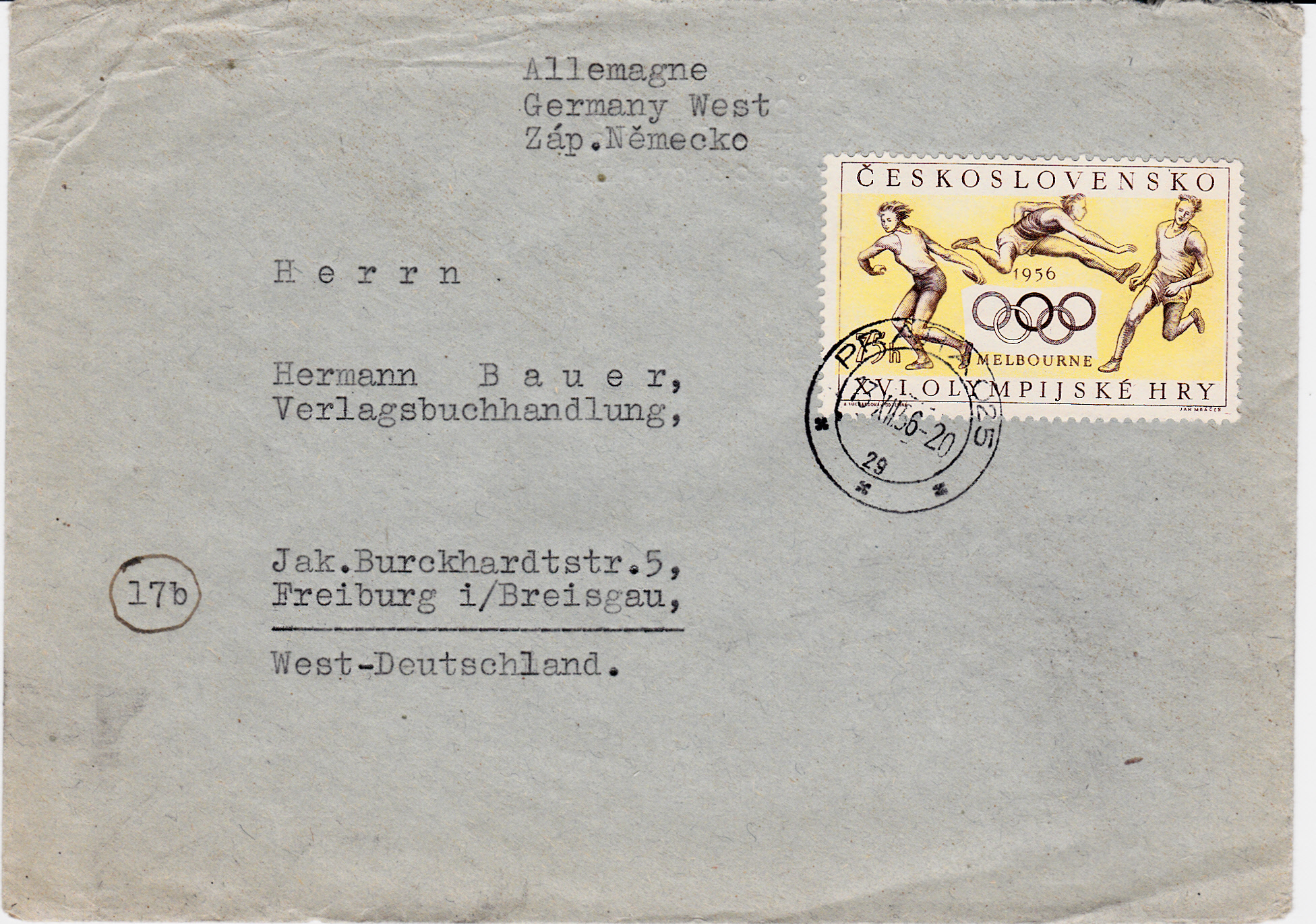 In der Tschechoslowakei erschien am 25.4.1956 eine Sondermarke (MiNr 967) zu den Olympischen Spiele 1956 in Melbourne mit einem Diskuswerfer, einem Hürdenläufer und einem Langstreckenläufer. Hier zeige ich einen Brief vom 13.12.1956, der mit dieser Marke frankiert ist.