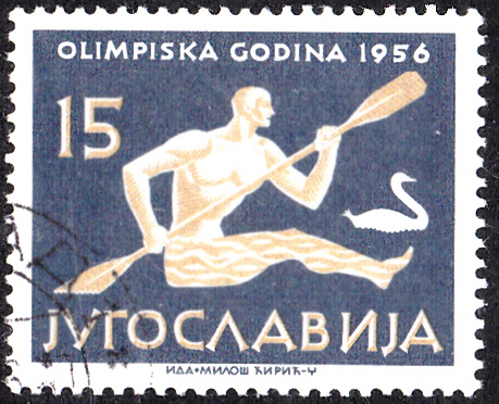 Auf dem zweiten Wert dieser jugoslawischen Serie zu den Olympischen Sommerspielen 1956 (MiNr 805) wird in einer etwas eigenwilligen Art ein Kanufahrer ohne Kanu gezeigt.