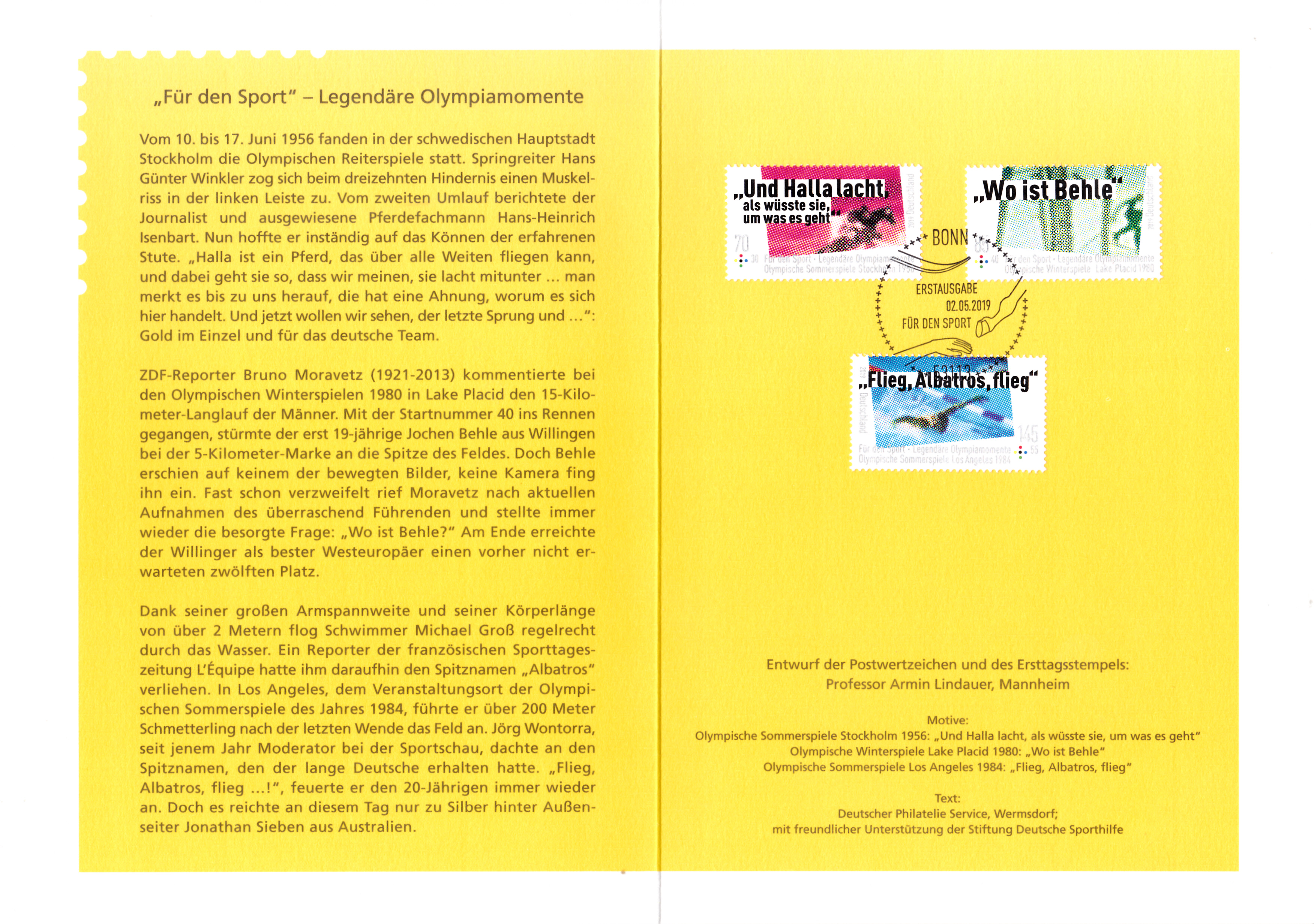 Klappkarte des Vorstandsvorsitzenden der Deutschen Post AG mit den drei Marken "Für den Sport" 2019 (MiNr 3460 bis 3462) mit Motiven zu "Legendären Olympiamomente" und dem Ersttagsonderstempel Bonn.