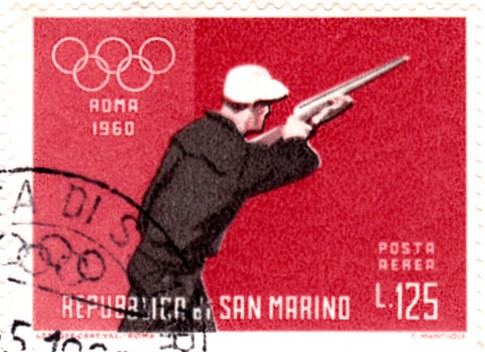 Jetzt fehlt nur noch eine Marke und die Serie aus San Marino ist komplett. Die Luftpostmarke zu 125 Lire (MiNr 568) bildet einen Sportschützen ab.