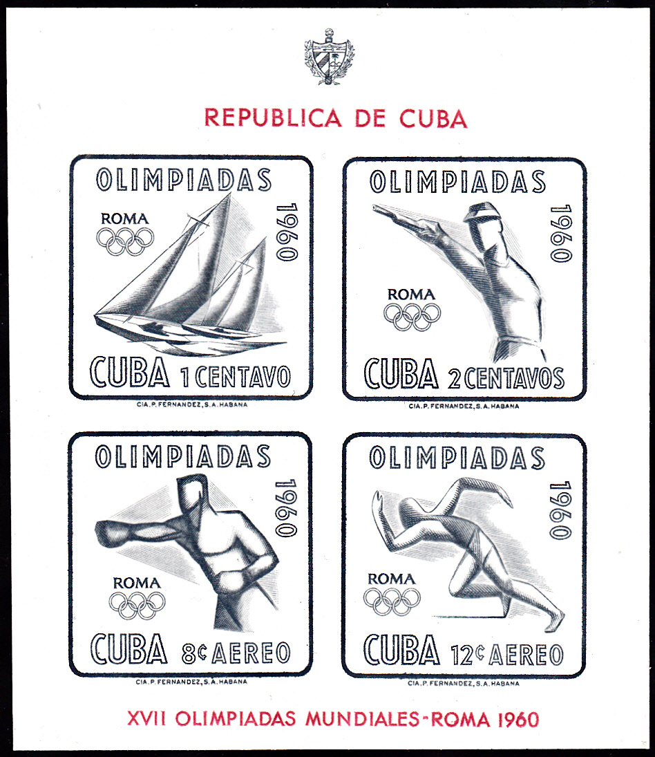 Aus Kuba kamen 12 Teilnehmer/innen zu den Wettkämpfen bei den Olympischen Spielen in Rom. Aus der kubanischen Serie zu den Sommerspielen 1960 stammt diese Marke (MiNr 669) mit einem Segelboot.