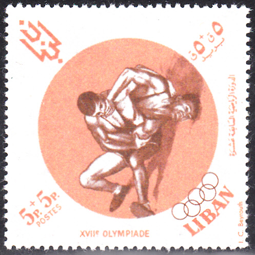 Das Markenbild dieser Marke der Serie aus dem Libanon (MiNr 696) zeigt zwei Ringer im Kampf.
