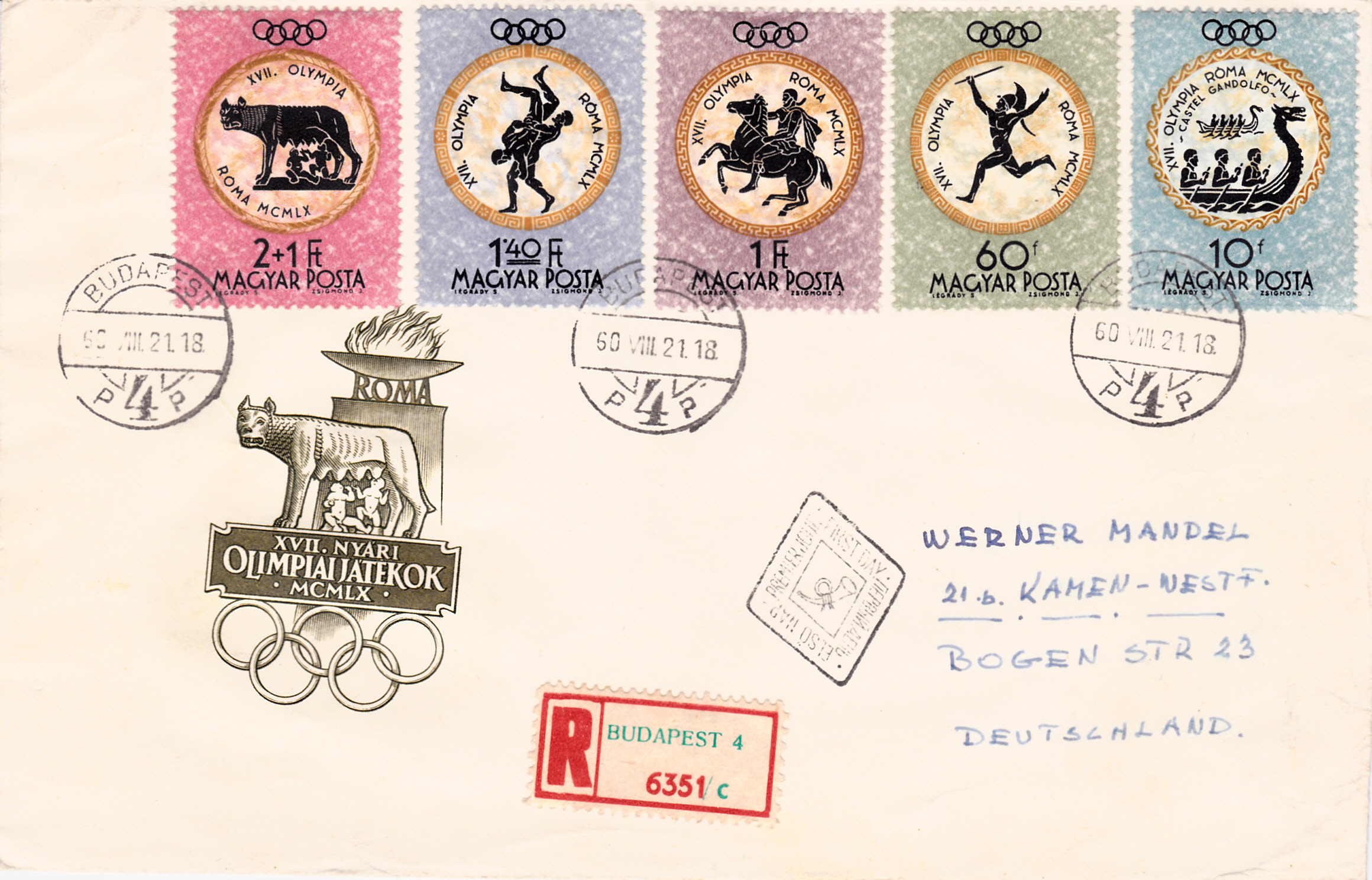 Auf diesem Brief wurden fünf Marken aus der bereits zu Beginn in diesem Thema gezeigten Serie Ungarns zu den Spielen 1960 in Rom auf einem Brief mit Einschreiben als Frankatur verwendet.