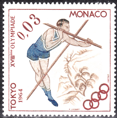 Eine weitere Marke aus Monaci (MiNr 786) bildet einen Stabhochspringer beim Überqueren der Latte ab.