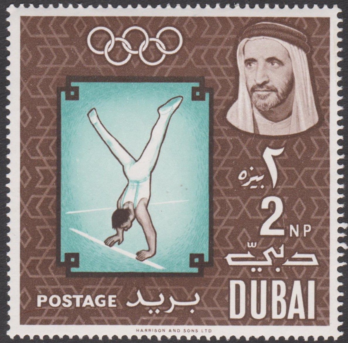 Diese Marke zu 2 NP aus Dubai, MiNr. 130 A, zeigt einen Sportler beim Bodenturnen: