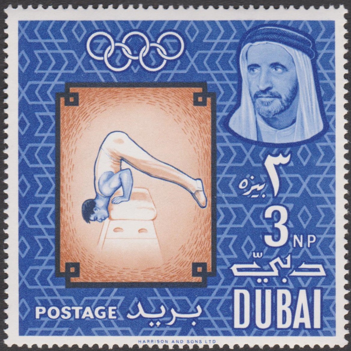 Diese Marke zu 3 NP aus Dubai, MiNr. 131 A, zeigt einen Sportler beim urnen am Seitpferd: