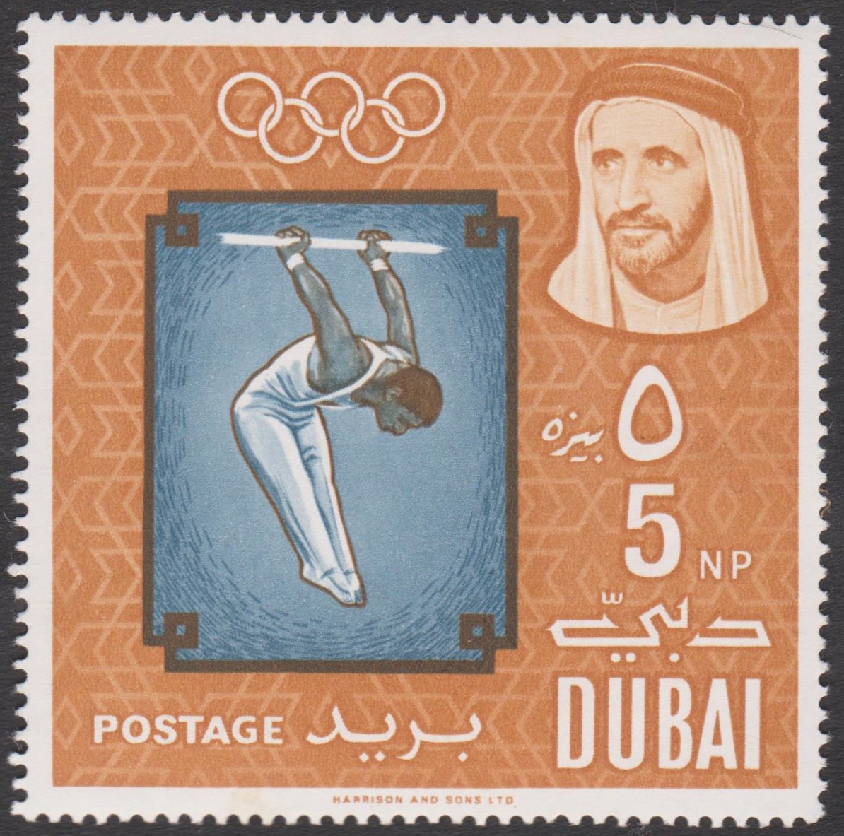 Diese Marke zu 5 NP aus Dubai, MiNr. 133 A, zeigt einen Sportler beim Turnen am Reck: