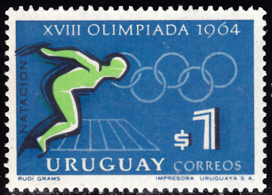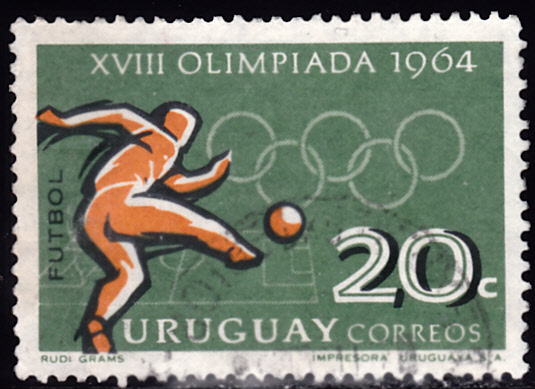 In Uruguay sind die Marken zu den Spielen 1964 erst im Jahre 1965 erschienen. Aus dieser Markenserie zeige ich die Marke zu 20c (MiNr 1012) mit einem Motiv zum Fußball.