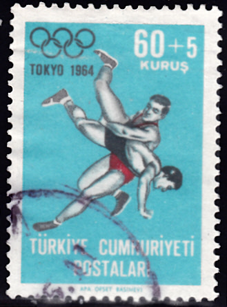 Aus der Türkei kommt diese Marke (MiNr 1926) mit einer Szene aus einem Ringkampf im freien Stil.