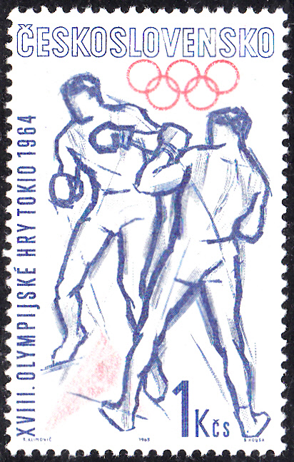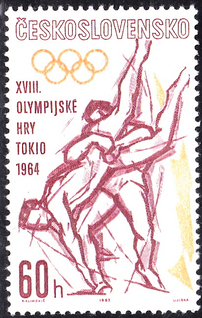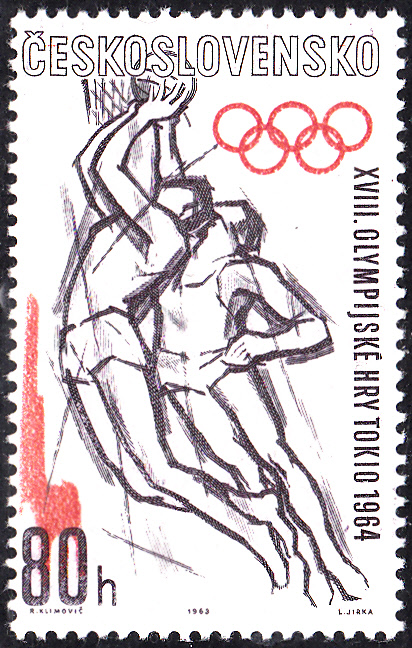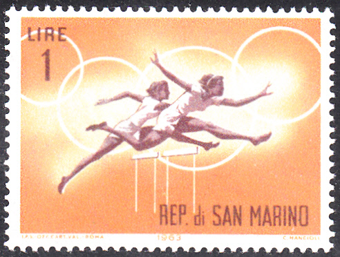 In San Marino ist 1963 bereits eine Markenserie zu den Olympischen Spielen 1964 in Tokio erschienen. Hier die Marke zu 1 Lira (MiNr 782) mit der Abbildung von zwei Hürdenläuferinnen.