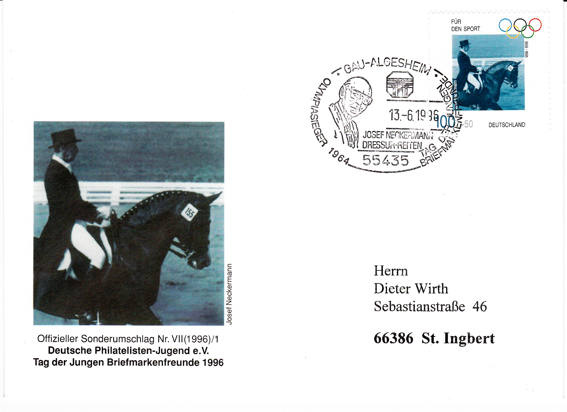 In der Serie zu den Olympischen Spiele 1996 zeigt eine Marke (MiNr 1862) Josef Neckermann. Diese ist hier mit dem Sonderstempel zum Tag der Jungen Briefmarkenfreunde vom Ersttag gestempelt. Im Bild des SST ist ein Porträt von Josef Neckermann zu sehen.