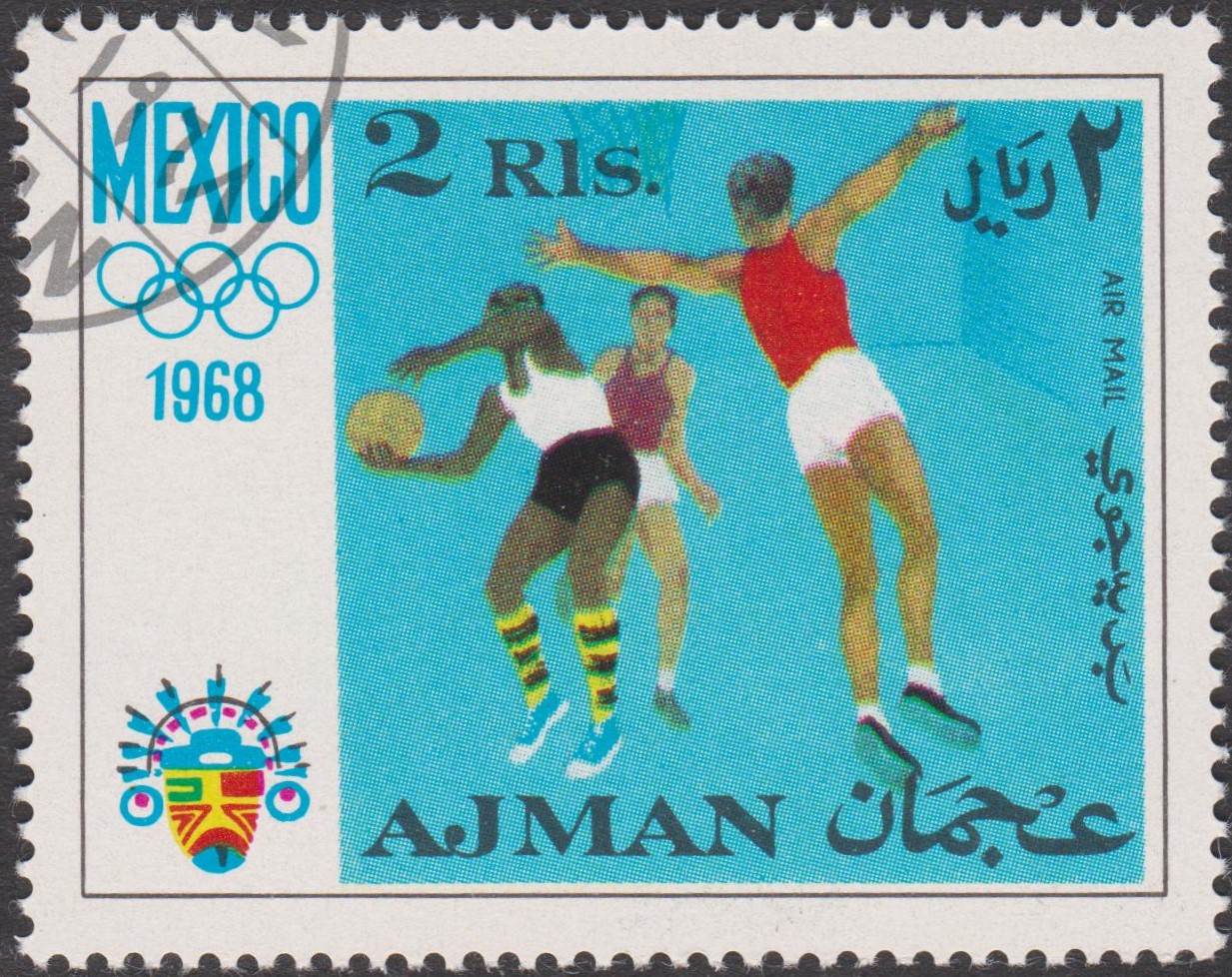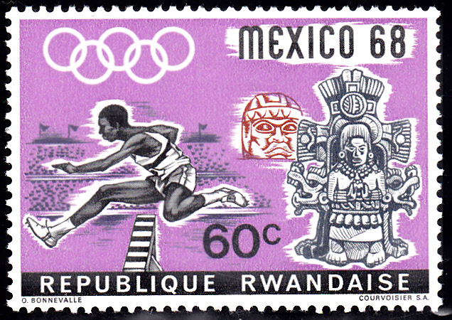 In Ruanda, das 1968 noch nicht bei den Olympischen Sommerspielen vertreten war, erschienen auch einige Marken zu den Spielen in Mexiko. Hier eine Marke mit Sprinter beim Start (MiNr 261 A).