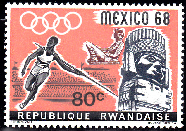 In Ruanda, das 1968 noch nicht bei den Olympischen Sommerspielen vertreten war, erschienen auch einige Marken zu den Spielen in Mexiko. Hier eine Marke mit Sprinter beim Start (MiNr 261 A).