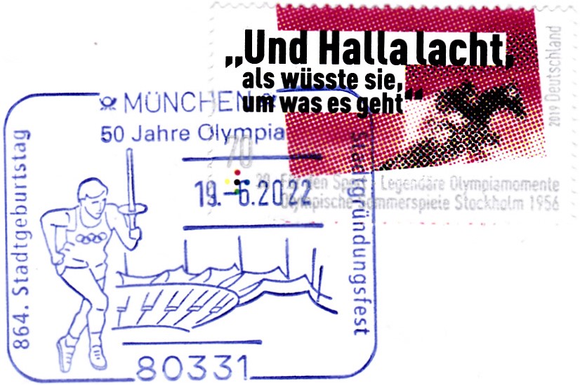 Im Stempelbild dieses Sonderstempels aus München vom 19.6.2022 zum Jubiläum "50 Jahre Olympia" werden ein Fackelläufer und das Olympiastadion in München gezeigt.