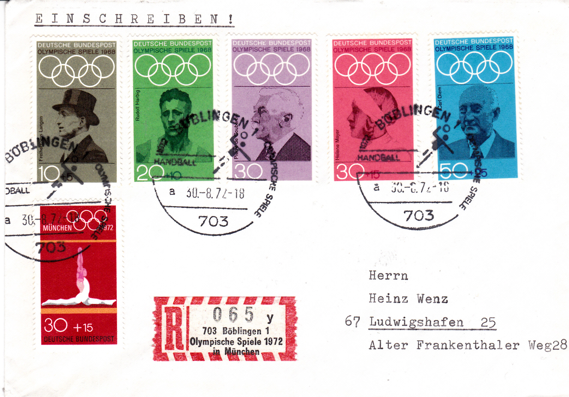 Ein weiterer Brief per Einschreiben mit dem Sonder-R-Zettel "703 Böblingen 1, Olympische Spiele 1972 in München" und mit dem Sonderstempel "Handball" vom 30.8.1972 mit dem Kennbuchstaben "a" mit Uhrzeit. Der Sonder-R-Zettel hat hier den Unterscheidungsbuchstaben "y", im Brief davor war dies der Buchstaben "z". Es waren also mindestens zwei Rollen Sonder-R-Zettel im Einsatz.