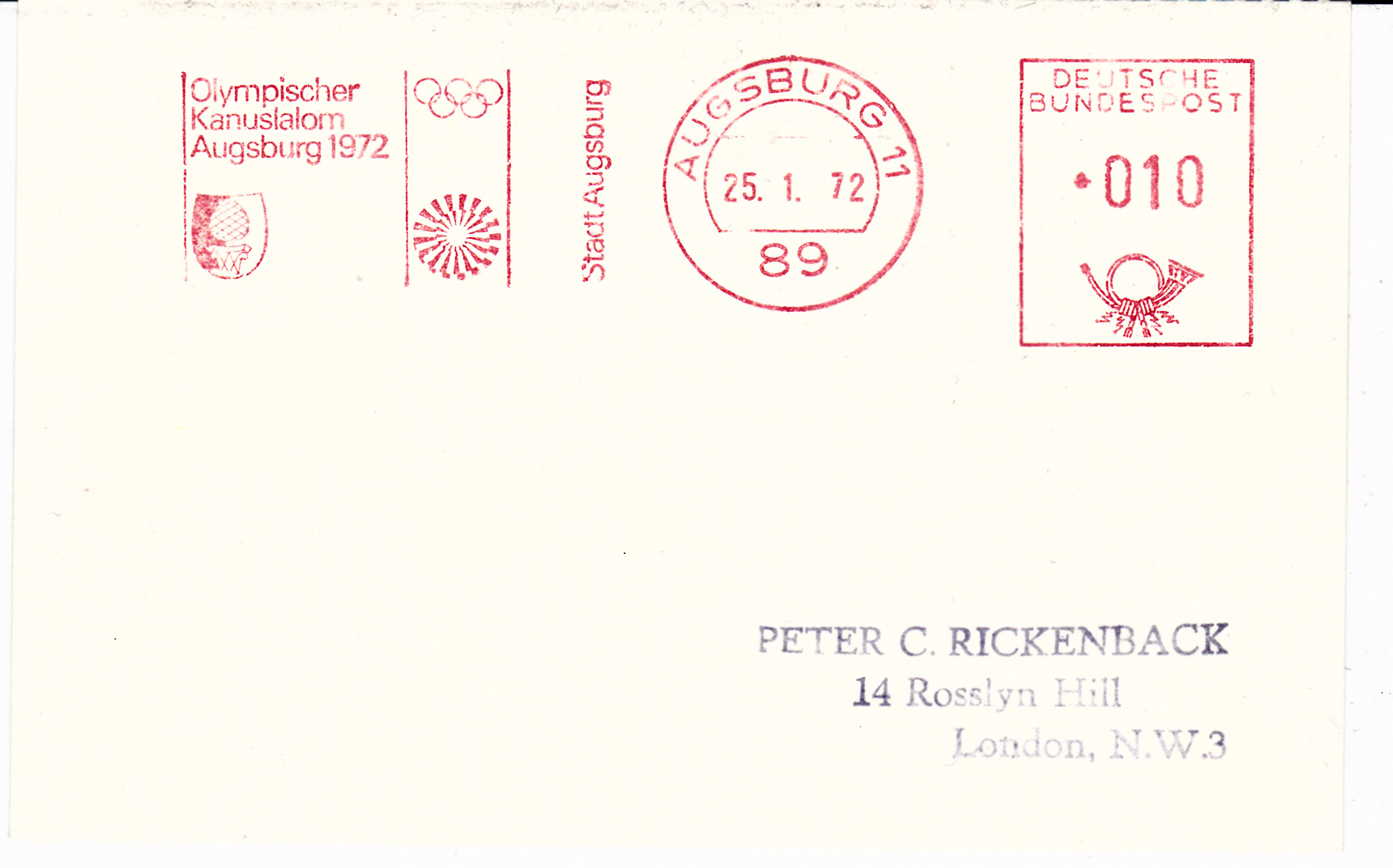 Die Wettbewerbe im Kanuslalom der Olympischen Spiele 1972 fanden in Augsburg statt. Hier ein Absenderfreistempel der Stadt Augsburg mit dem Werbeeinsatz "Olympischer Kanuslalom Augsburg 1972".