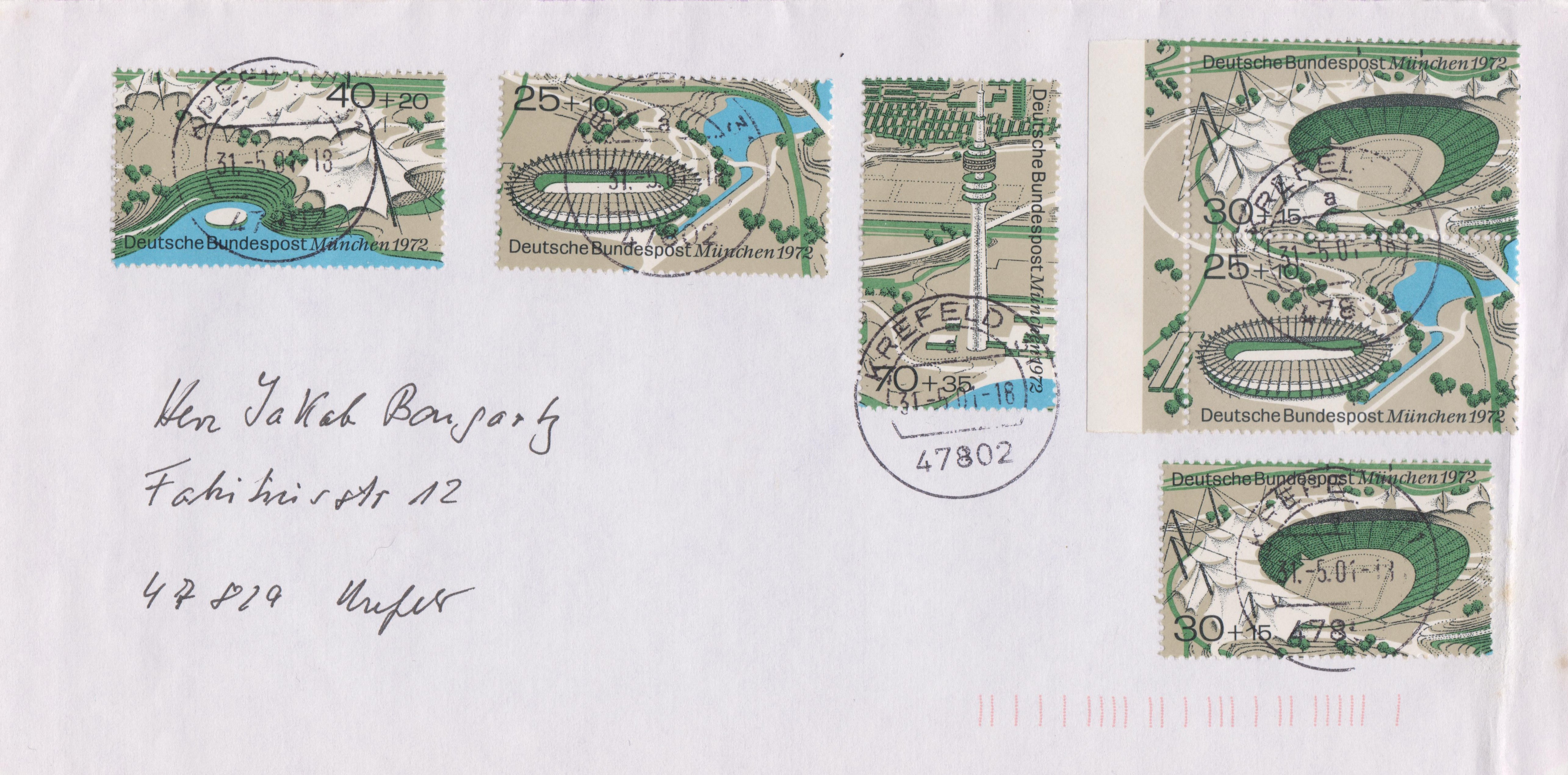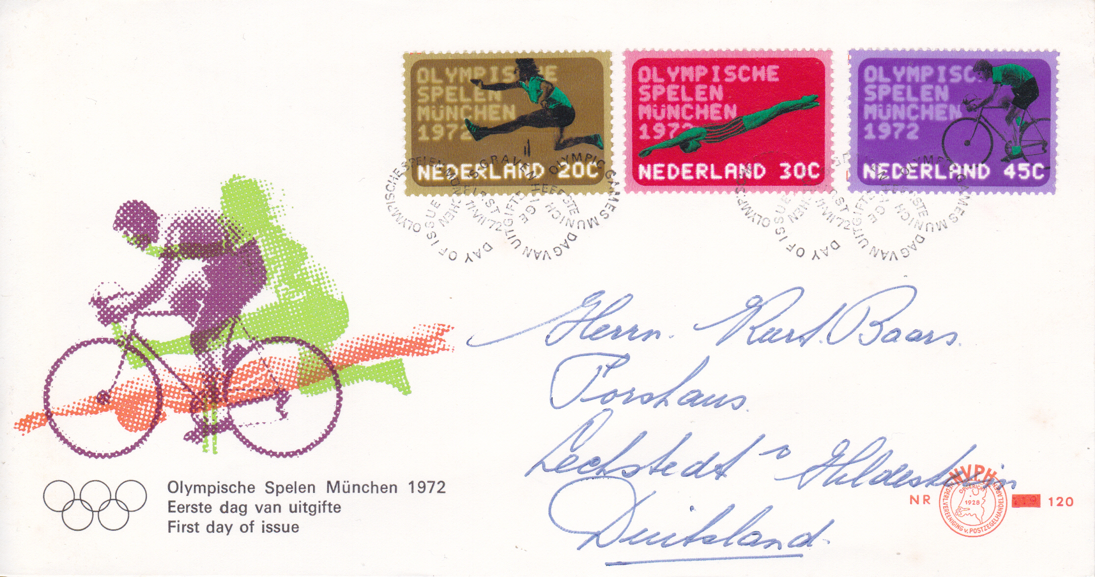 Gelaufener FDC mit den drei bereits gezeigten Marken aus den Niederlande (MiNr 991-993) zu den Spielen in Minchen.