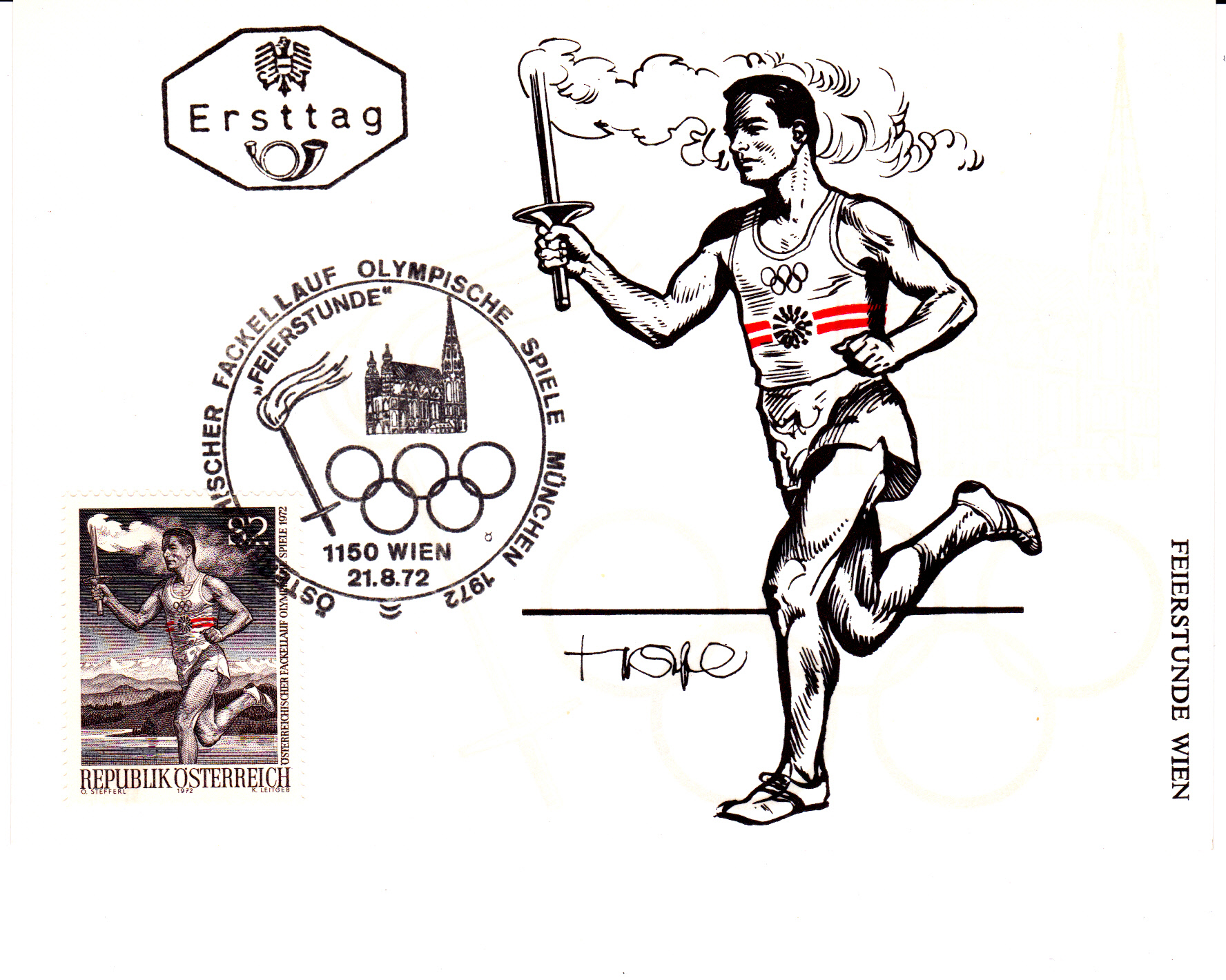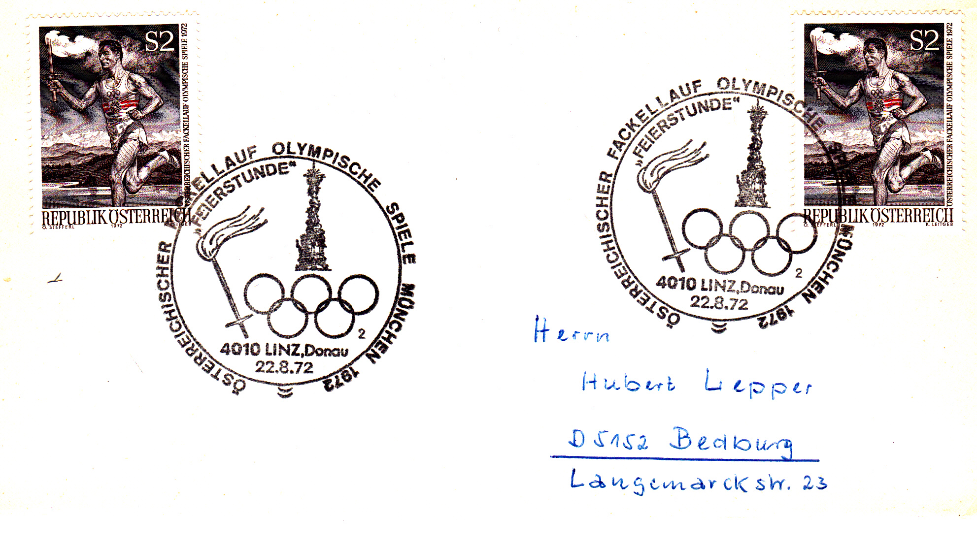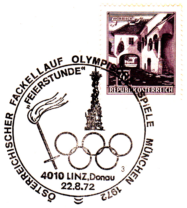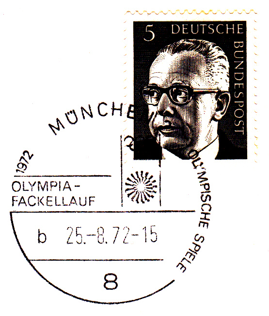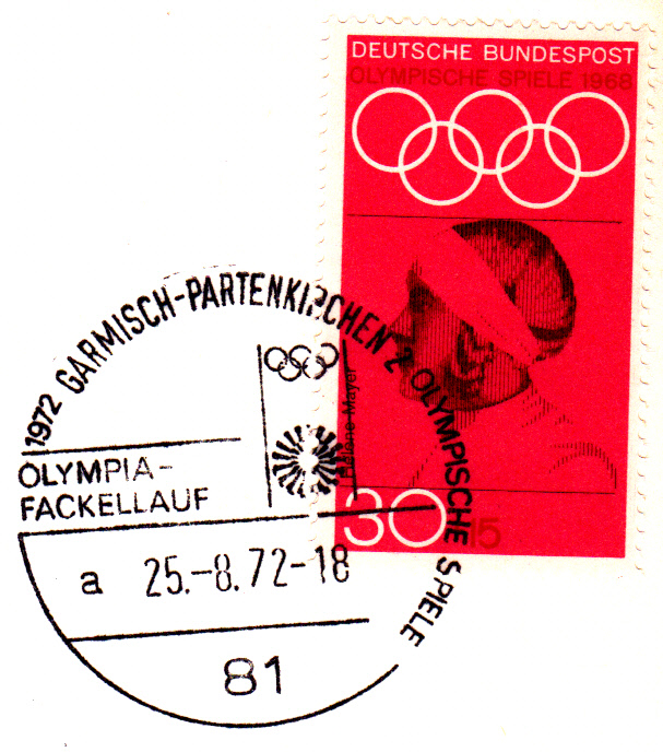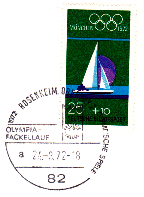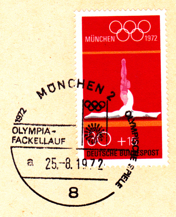 Am 25.8.1972 erreichte der Fackellauf den Olympiaort München, wie dieser Sonderstempel aus München vom 25.8.1972 Kennbuchstabe "a" ohne Uhrzeit beweist.