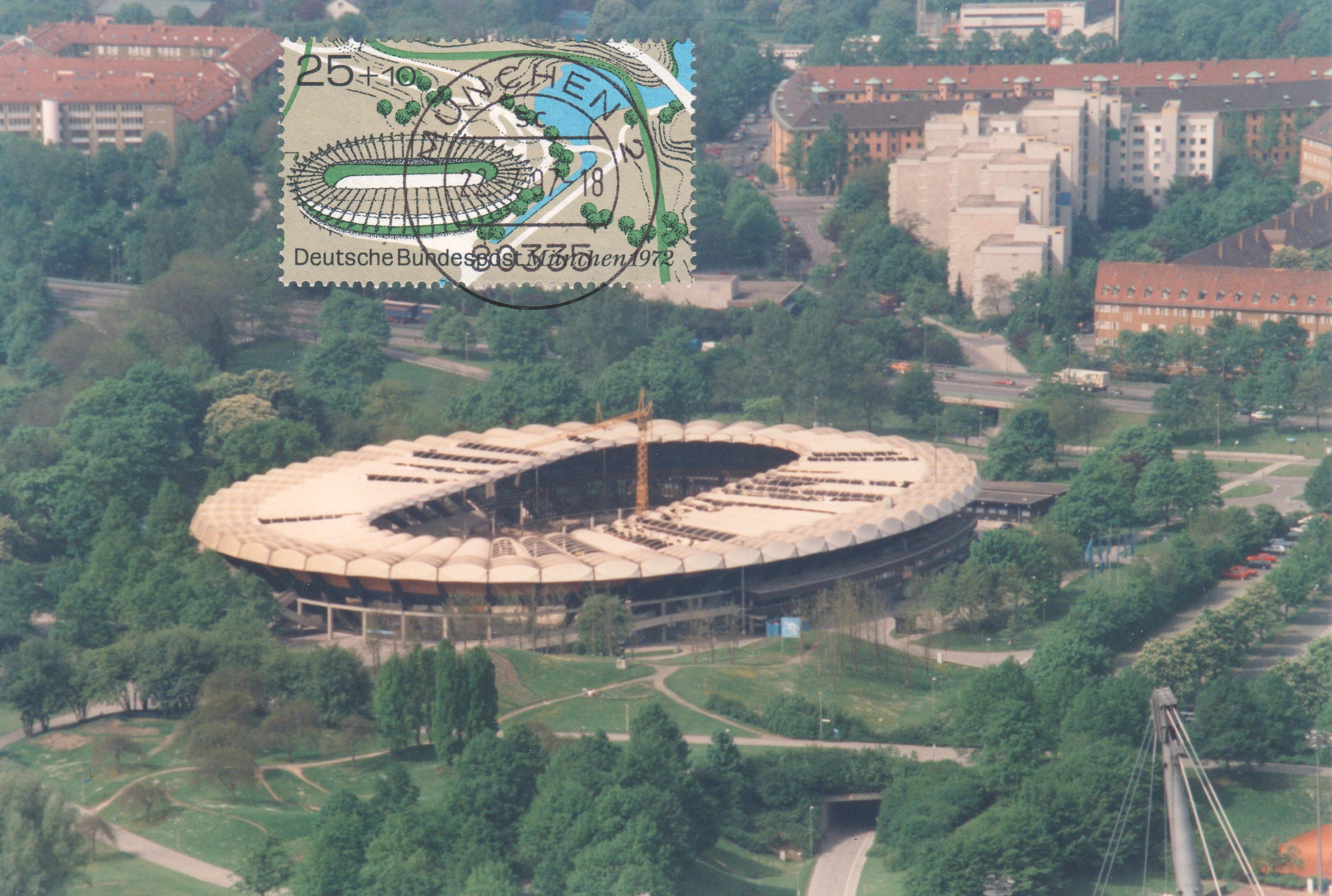 Bund MiNr. 724 zeigt das Olympiastadion und das Schwimmstadion der Olympischen Sommerspiele in München, hier auf einem passenden Foto entwertet per Tagesstempel MÜNCHEN 2 am 22.07.1997:
