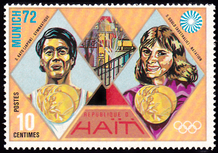 Auf dieser Marke aus Haiti (MiNr 1206) wird auch noch auf der linken Seite der hier schon vorgestellte Sawao Katō, japanischer Kunstturner, mit seinen drei Goldmedaillen von München gezeigt.