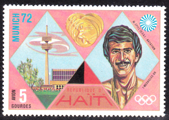 Diese Marke (MiNr 1214mit dem siebenfachen Olympiasieger beim Schwimmen Mark Spitz beendet die Markenserie Haitis mit Olympiasiegern 1972.