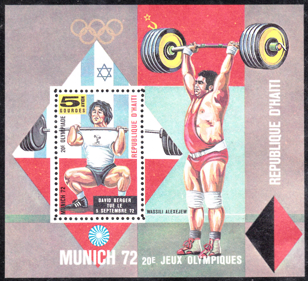 Auf diesem Block aus Haiti (MiNr Block 50) wird der hier schon gezeigte Olympiasieger im Superschwergewicht beim Gewichtheben Wassili Alexejew abgebildet. Auf der Marke des Blockes wird der Gewichtheber David Mark Berger gezeigt, der bei der Geiselnahme bei den Spielen 1972 zu Tode kam.