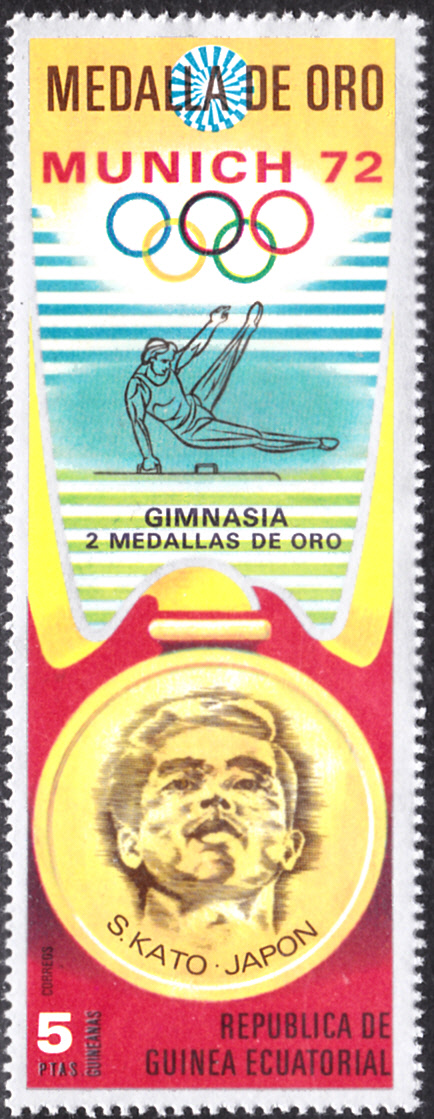 Den bereits erwähnten Doppelolympiasieger beim Turnen Sawao Katō zeigt diese Marke (MiNr 166) der Serie aus Äquatorial-Guinea.