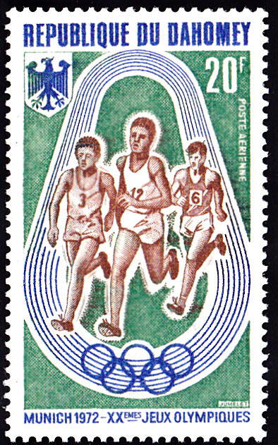 Zu den Olympischen Spielen erschien in Dahomey eine Serie mit drei Marken. Hier die Marke zu 20F (MiNr 484) mit einer Laufbahn, Läufer und dem Wappen der Bundesrepublik Deutschland.