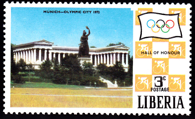 Die Marken der Serie aus Liberia stellen die Olympiastadt vor. Auf dieser Marke (MiNr 486 A) wird die Bavaria mit der Ruhmeshalle gezeigt.