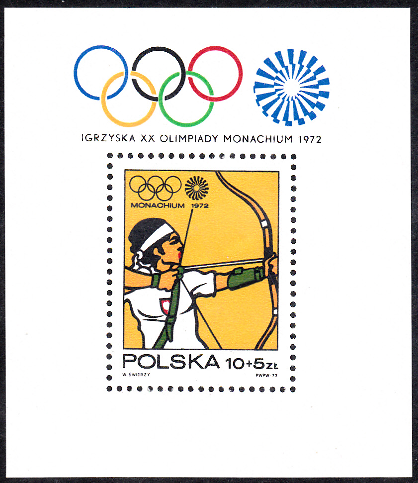 Zur Ausgabe Polens zu den Sommerspielen 1972 gehört auch noch ein Block (MiNr Block 51 mit Marke MiNr 2157). Die Marke ist bildgleich zu der bereits hier am 31.8.2016 gezeigten Marke mit einer Bogenschützin.