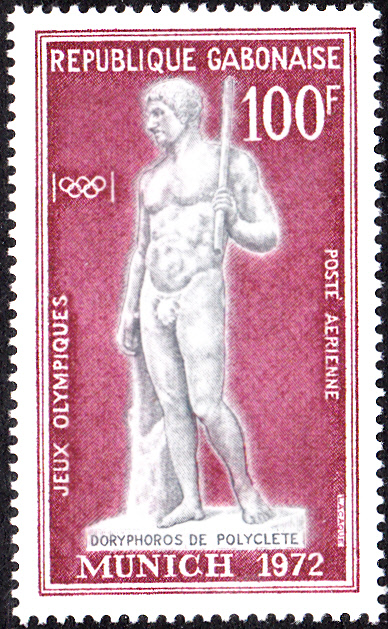 In der Serie aus Gabun zu den Spielen in München werden Altgriechische Skulpturen gezeigt. Hier die erste Marke (MiNr 470) mit der Darstellung eines Diskuswerfers.