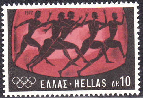 Die fünfte und letzte Marke (MiNr 1118) dieser griechischen Serie zeigt eine antike Darstellung "Jugendliche beim Wettlauf".