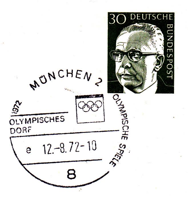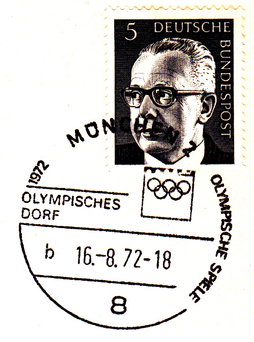 Sonderstempel 8 München 2 "Olympisches Dorf" vom 12.8.1972 Kennbuchstabe "d" mit Uhrzeit.