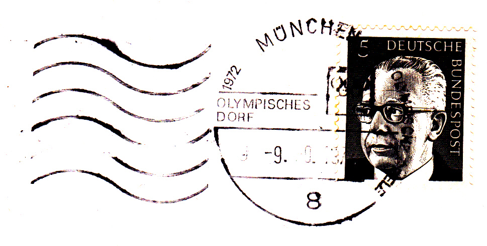 Sonderstempel 8 München 2 "Olympisches Dorf" vom 16.8.1972 Kennbuchstabe "b" mit Uhrzeit. In der Regel wurden die Stempel mit den Kennbuchstaben a, b und c bei der Sonderstempelstelle in der Wredestraße abgedruckt, die Datums- und Uhrzeitangaben waren fortlaufend, auch wenn kein Wettbewerb im Olympia-Stadion war.