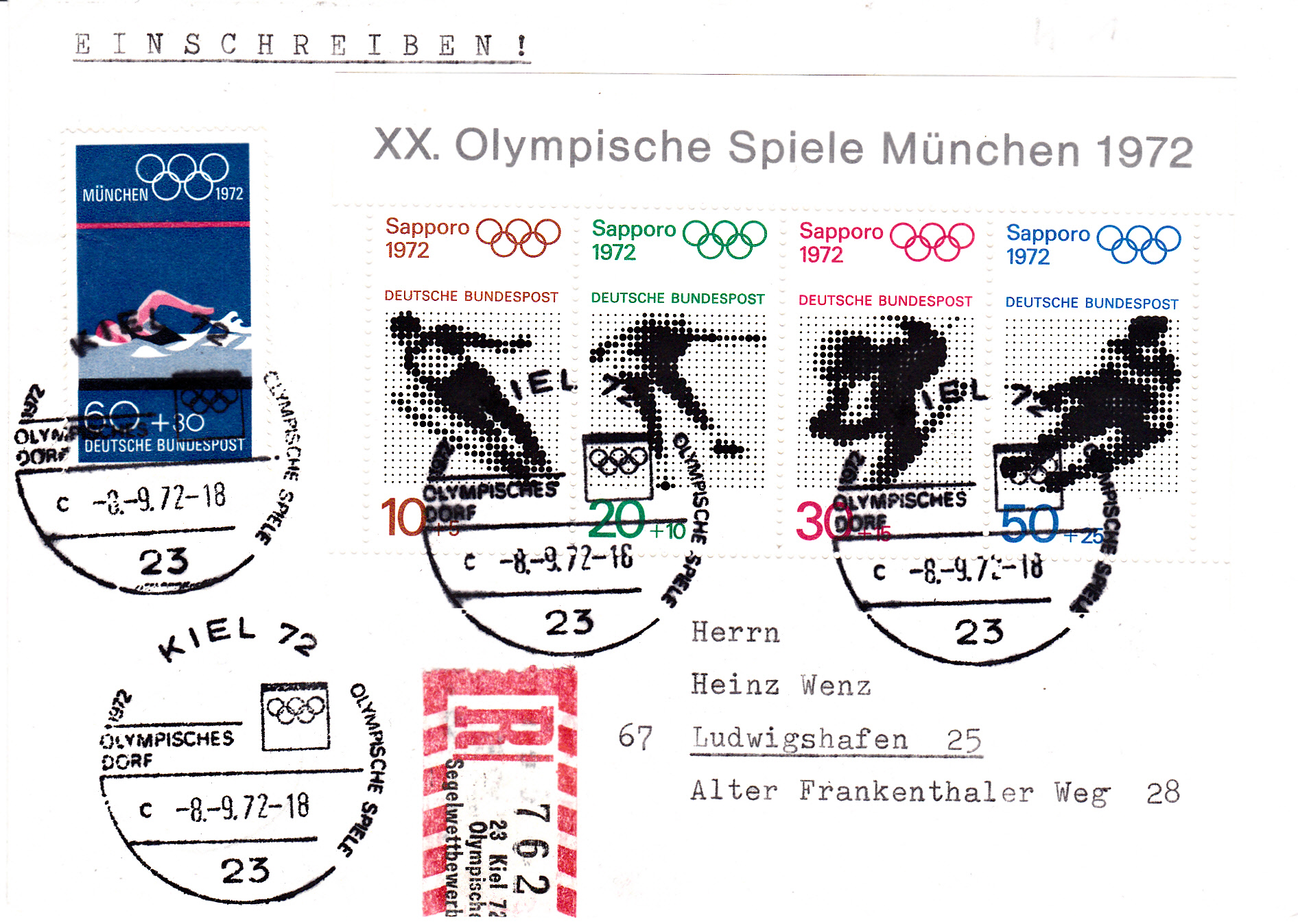 Brief per Einschreiben mit dem Sonder-R-Zettel "23 Kiel 72, Olympische Segelwettbewerbe 1972" und mit dem gleichen Sonderstempel "Olympisches Dorf" vom 8.9.1972 mit dem Kennbuchstaben "c" und mit Uhrzeit.
