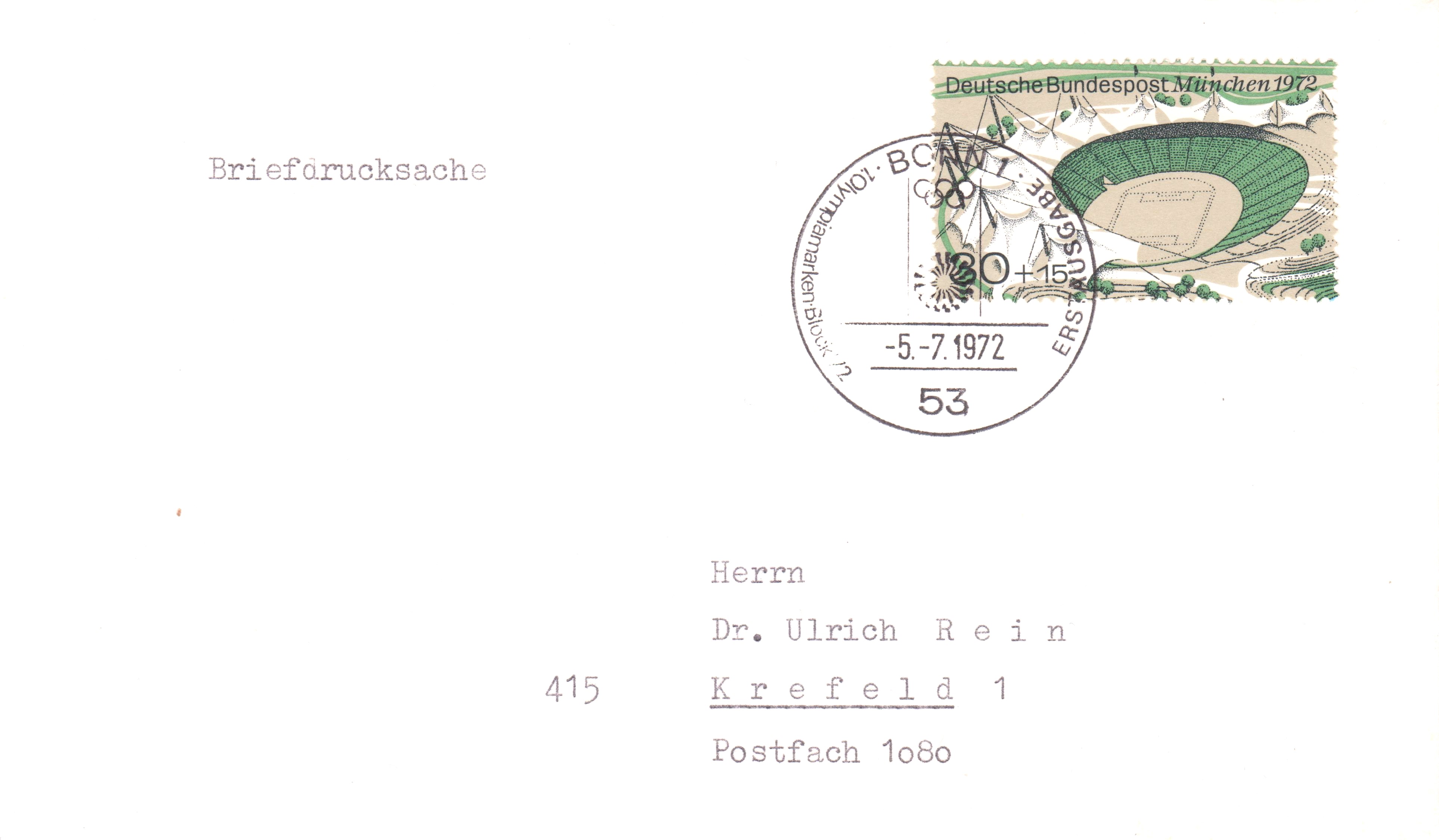 Bund MiNr. 724 zeigt das Olympiastadion der Olympischen Sommerspiele in München, hier als Einzelfrankatur am 05.07.1972 portogerecht auf Briefdrucksache bis 20 g, entwertet mit Ersttagsstempel: