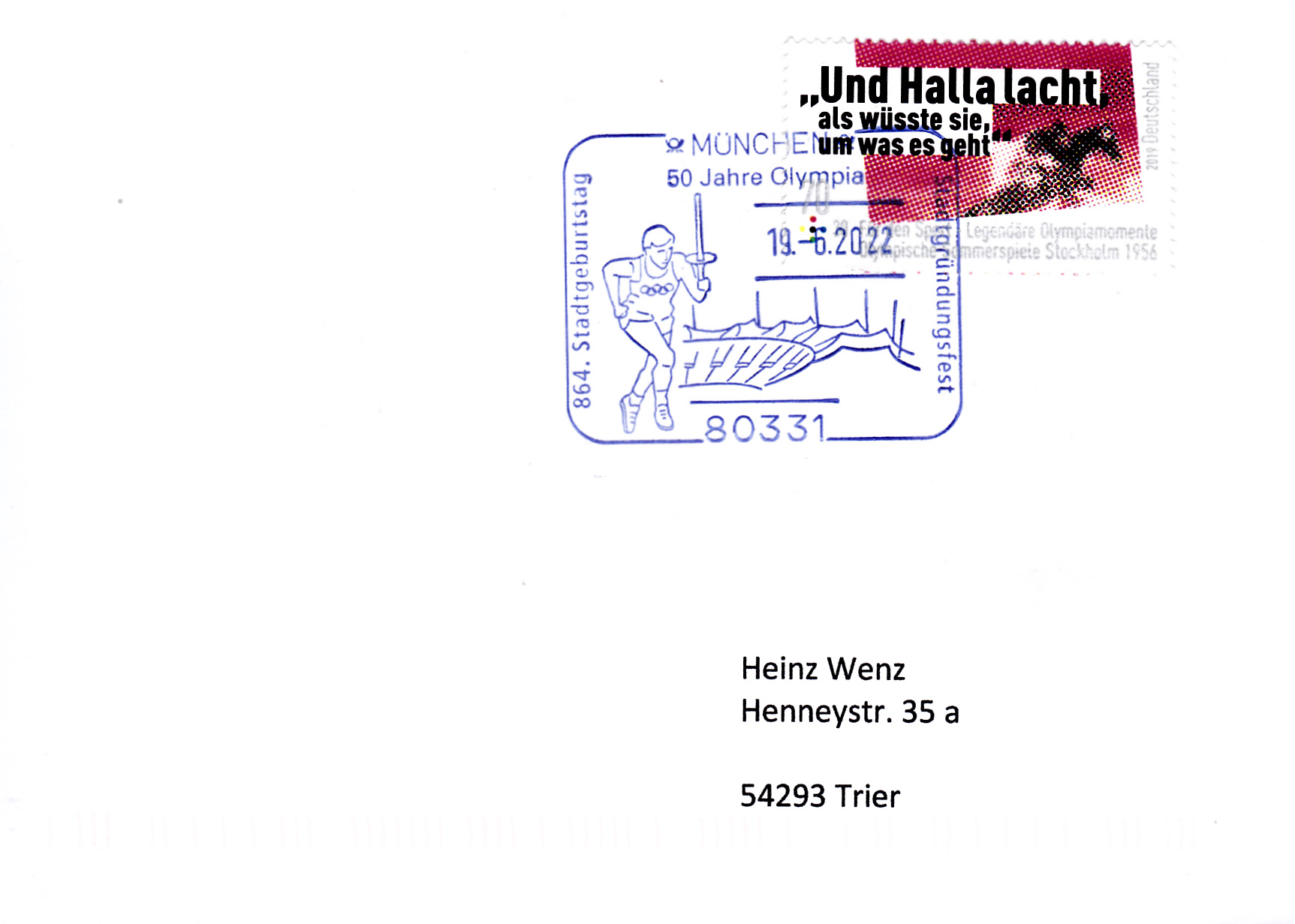 Im Stempelbild dieses Sonderstempels aus München vom 19.6.2022 zum Jubiläum "50 Jahre Olympia" werden ein Fackelläufer und das Olympiastadion in München gezeigt.