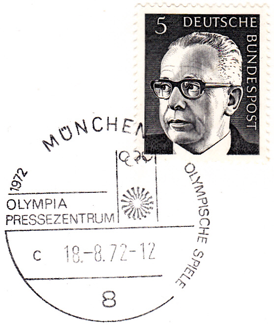 Hier ein Sonderstempel "Olympia Pressezentrum" vom 12.8.1972 mit Uhrzeit und dem Kennbuchstaben "e".