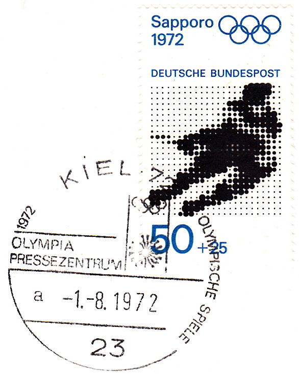 Hier ein Sonderstempel "Olympia Pressezentrum" aus Kiel vom 1.8.1972 ohne Uhrzeit mit voller Datumsangabe und mit Kennbuchstabe "a".