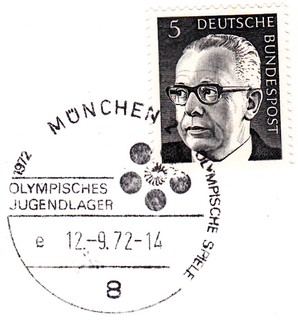 Sonderstempel "Olympisches Jugendlager" vom 12.9.1972 mit Uhrzeit und mit dem Kennbuchstaben "d".