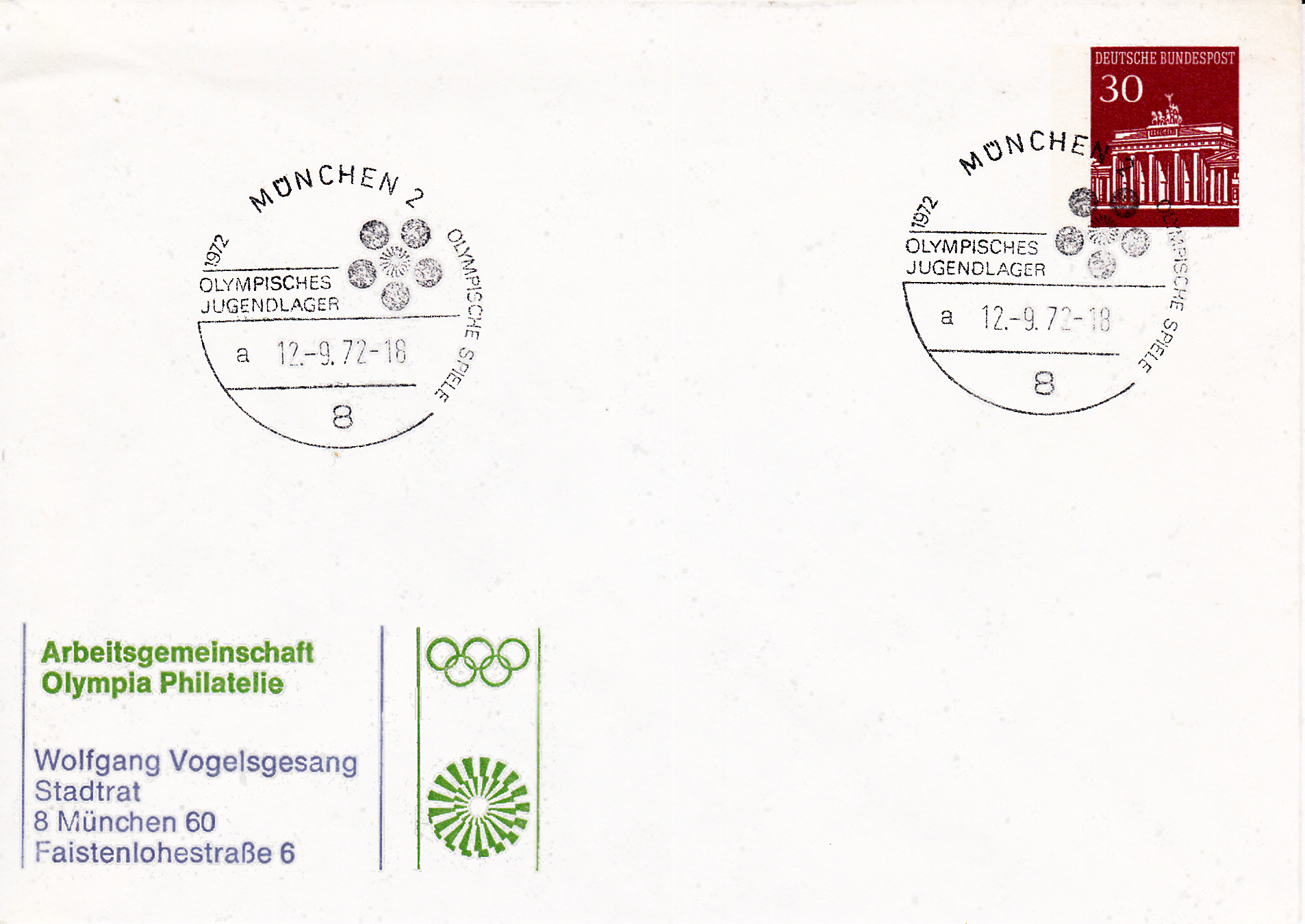 Der bereits gezeigte Sonderstempel "Olympisches Jugendlager" mit Uhrzeit und Kennbuchstabe "a" hier vom 12.9.1972 auf einer Ganzsache der Arbeitsgemeinschaft Olympia Philatelie. Der Umschlag ist leider nicht verschickt worden.